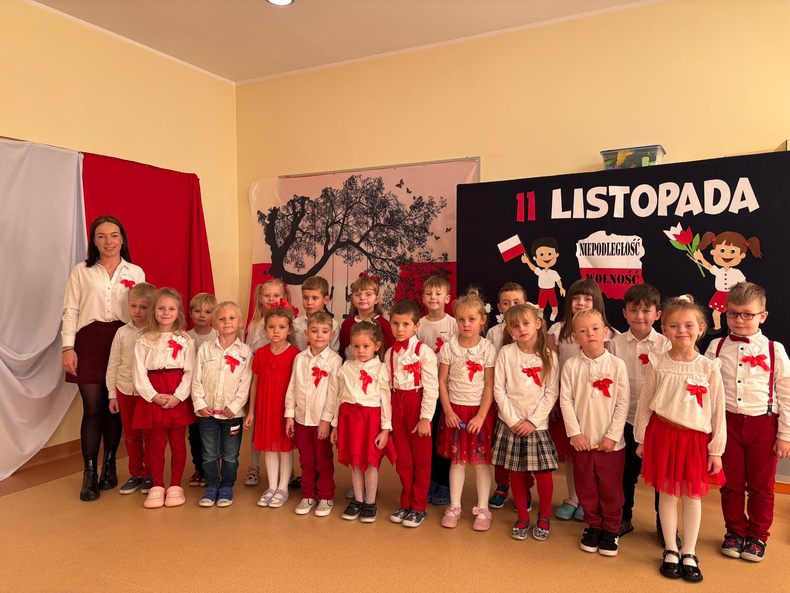 Dzieci przygotowały piękny program artystyczny 🎤🎶 Ubrane odświętnie w biało-czerwone stroje – barwy naszej Ojczyzny ❤️🤍 – z ogromną dumą zaprezentowały swoje występy przed Dyrekcją oraz nauczycielami.