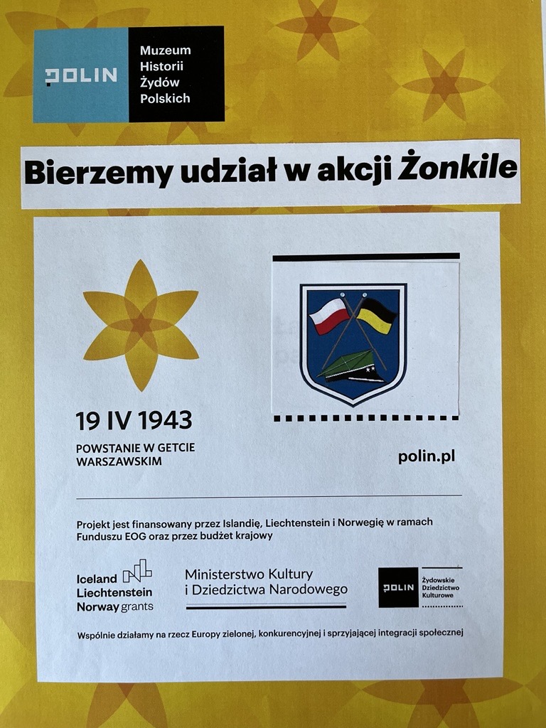 19 kwietnia przypada 83 rocznica powstania w getcie warszawskim. Symbolem pamięci tego wydarzenia jest żonkil, gdyż ostatni przywódca zrywu Marek Edelman w każdą rocznicę składał bukiet żółtych kwiatów pod Pomnikiem Bohaterów Getta. Aby upamiętnić ofiary tego wydarzenia Nasza szkoła, jak co roku, włączyła się w akcję społeczno-edukacyjną „Żonkile” organizowaną przez Muzeum Historii Żydów Polskich POLIN, która mana celu propagowanie wiedzy na temat powstania w getcie warszawskim.