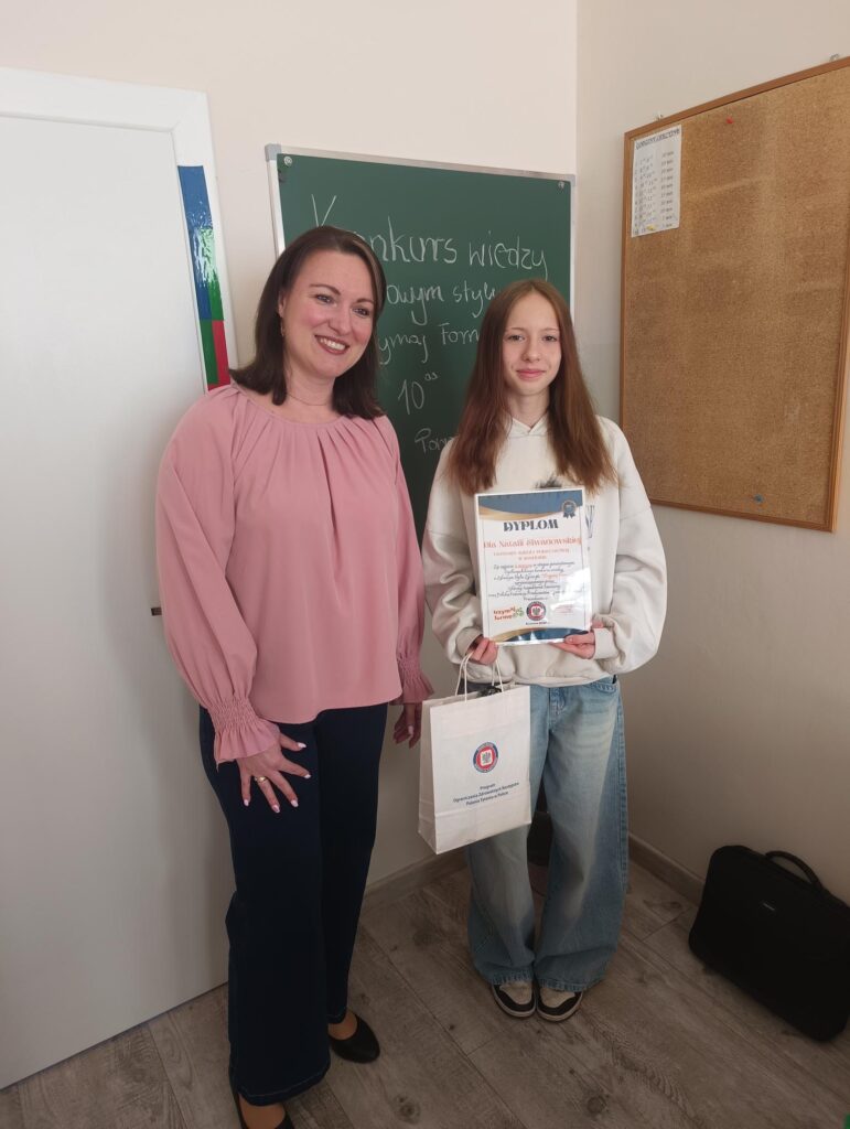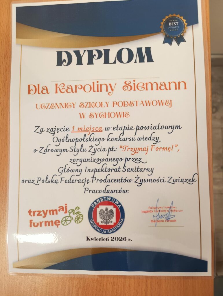 Z ogromną dumą informujemy, że Karolina Siemann zdobyła 🥇 I miejsce w powiecie wejherowskim w ogólnopolskim konkursie wiedzy o zdrowym stylu życia „Trzymaj Formę”! To wyjątkowe osiągnięcie w konkursie organizowanym przez Główny Inspektorat Sanitarny oraz Polską Federację Producentów Żywności – Związek Pracodawców 💚